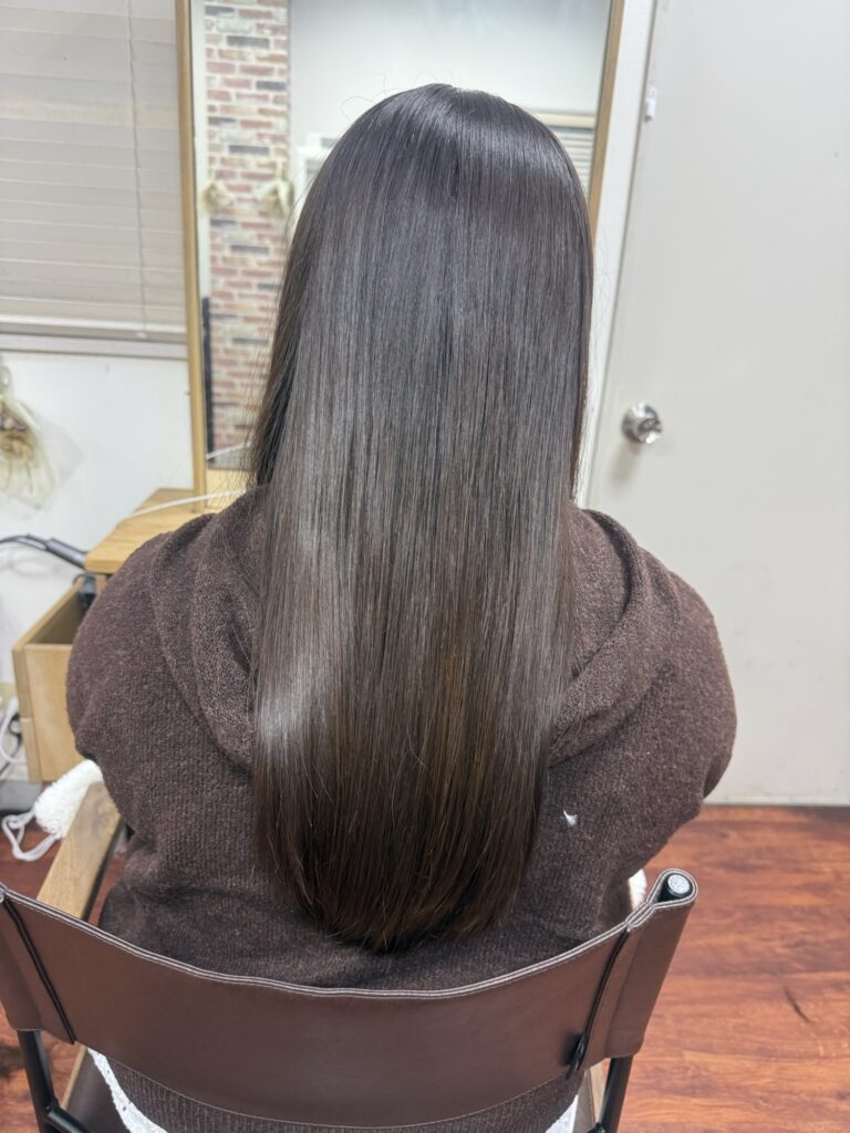 前髪の強い癖(特に生え際)もしっかり伸ばして色は赤みのあるチョコレートっぽい色とくすませたショコラ系の色をミックスして髪質改善カラーで染めています。
