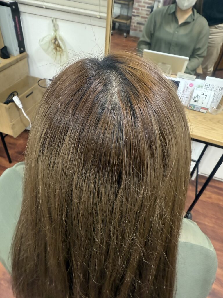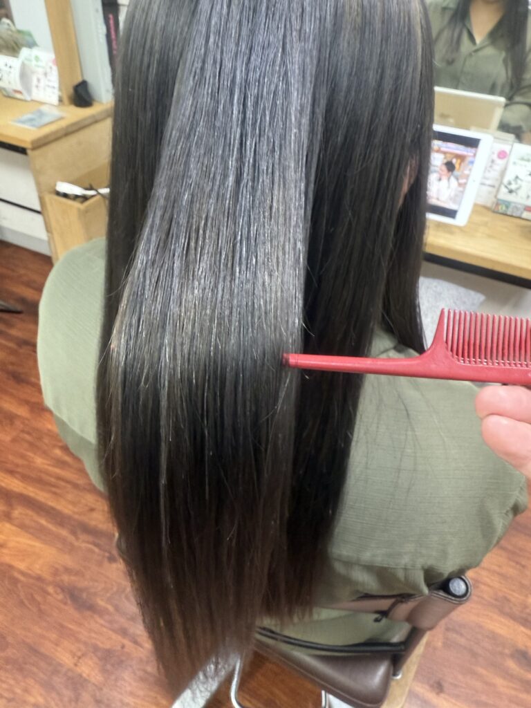 元々の癖がそんなに強くなくダメージで広がりや手触りが気になる、パヤパヤ収めたい、手触り良くしたいとのことでしたので優しく薬を効かせる設定でチリチリさせたりビビり毛にならないように気を付けて栄養補給しケアをしながらストレートをしています。