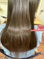 お店に伺うのは2度目です。1度目は矯正と白髪染めで伺いました。今回は根元の白髪が目立ってきてしまったので白髪染めとトリートメントをしてもらいました。1度目の時と同様に、ひとつひとつ丁寧で、とても綺麗に染めていただきました。今でも髪の状態はサラサラで艶々で、なんのストレスも無く過ごせています。朝も髪をサッととかすだけで良いのが、とっても幸せです。ありがとうございます。
