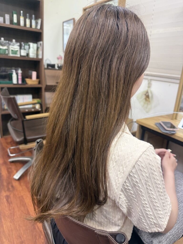 顔まわりや中間から毛先にかけてブリーチ履歴がありましたがオーダーメイドで薬剤を塗り分けてストレートにしました。